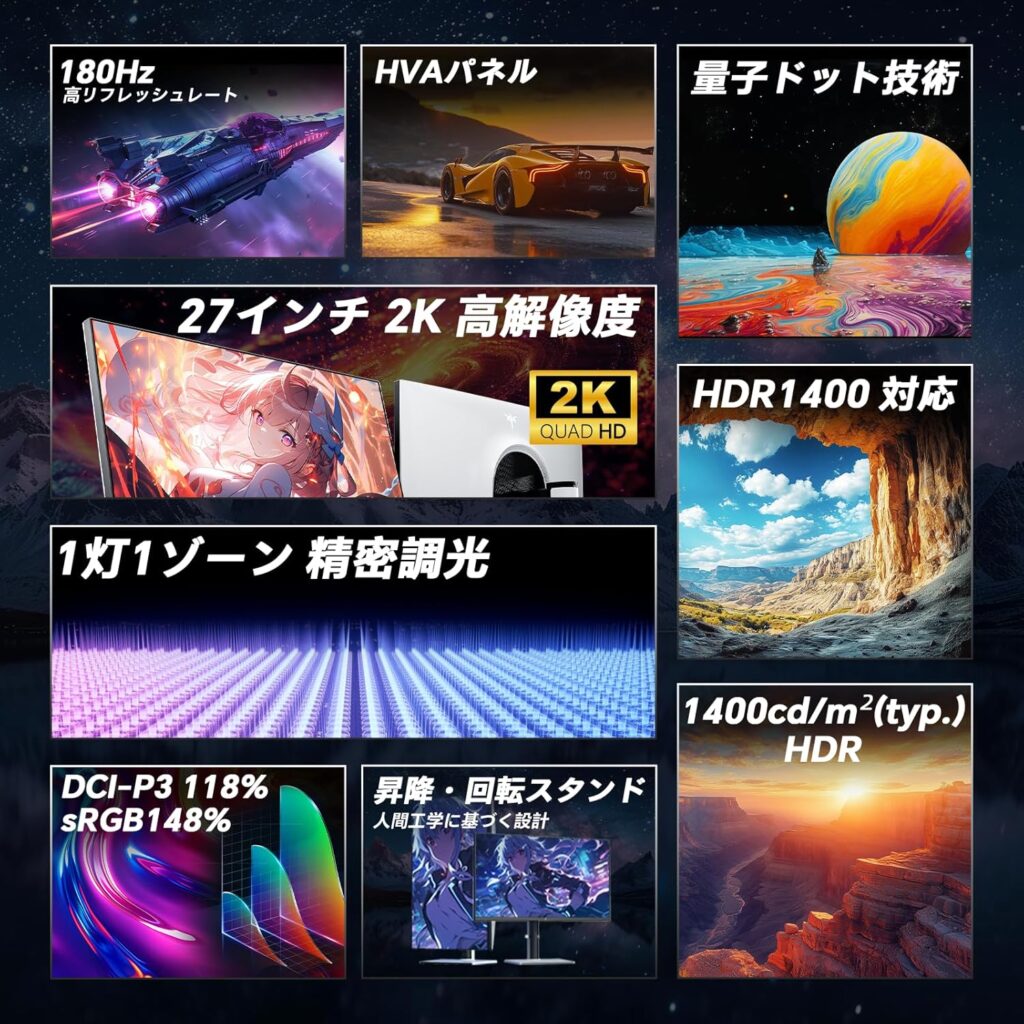 2024年に日本へ進出してきたメーカーだけど、現時点では「2~3万円」で買えるほどコスパ最高なので「フルHD」もしくは「WQHD」の高性能ゲーミングモニターを買いたい場合は是非。