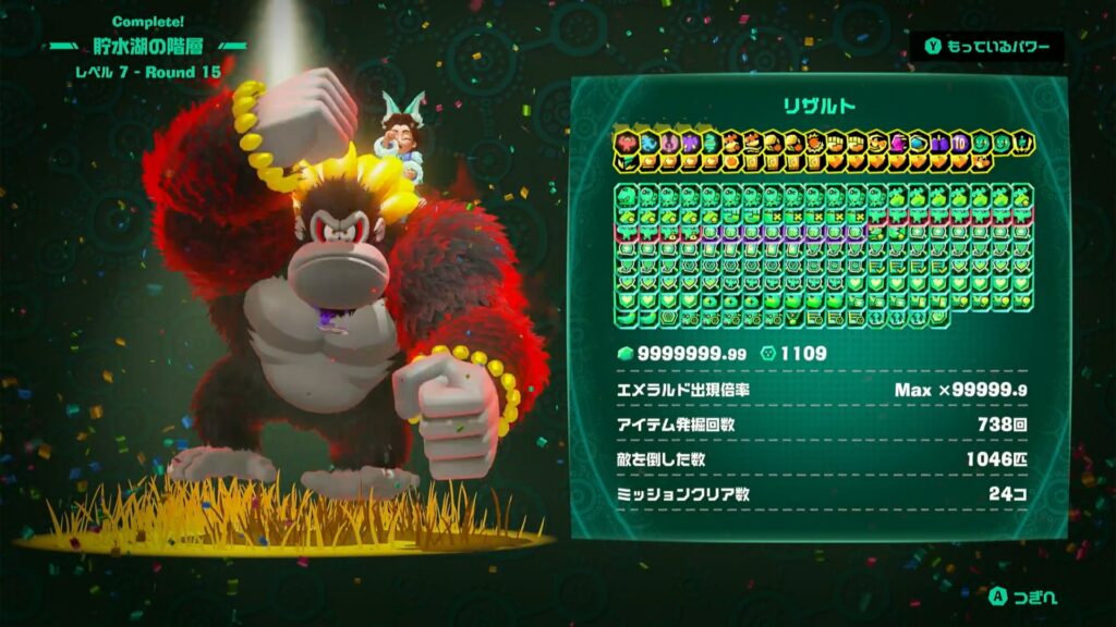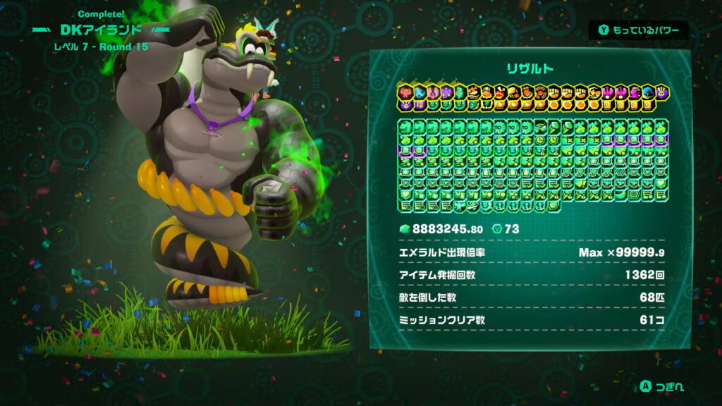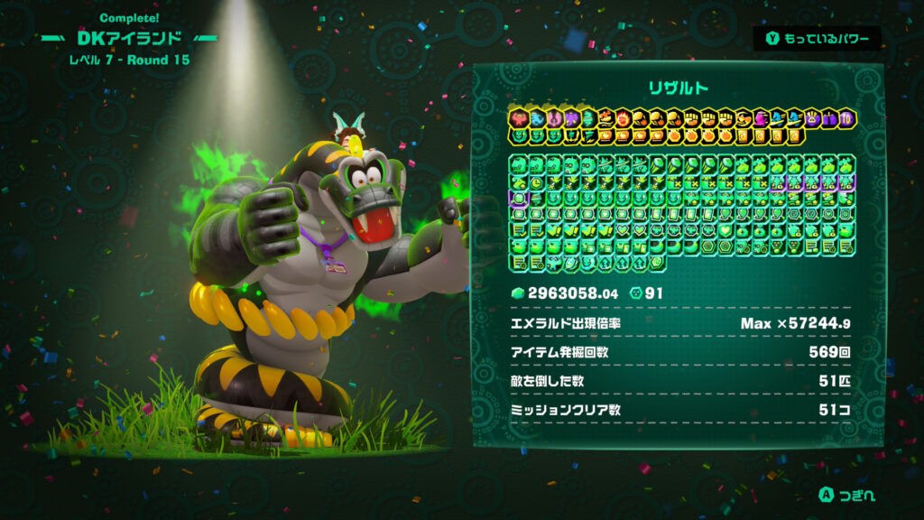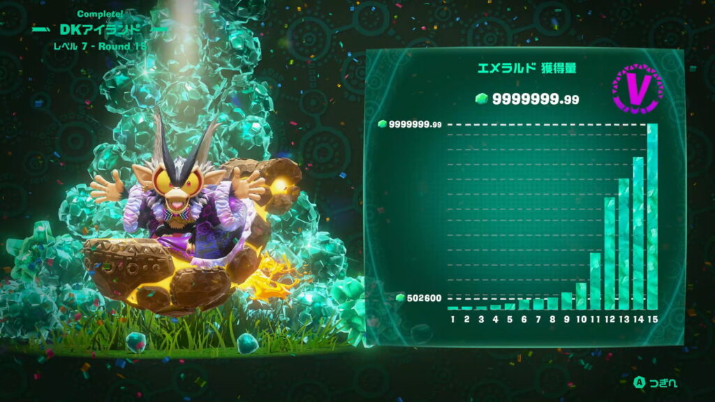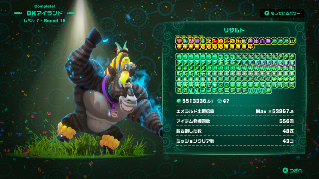 Aより最高評価であるヴォイドコングの頭文字にちなんで「V(ビクトリー?)」があることまで知ったので、サモラン以来の「全ステカンスト」を目指してみたいと思い、まずはエメラルドラッシュで初めてプレイして以来、かなり沼にハマったDKアイランドを攻めることにした。
