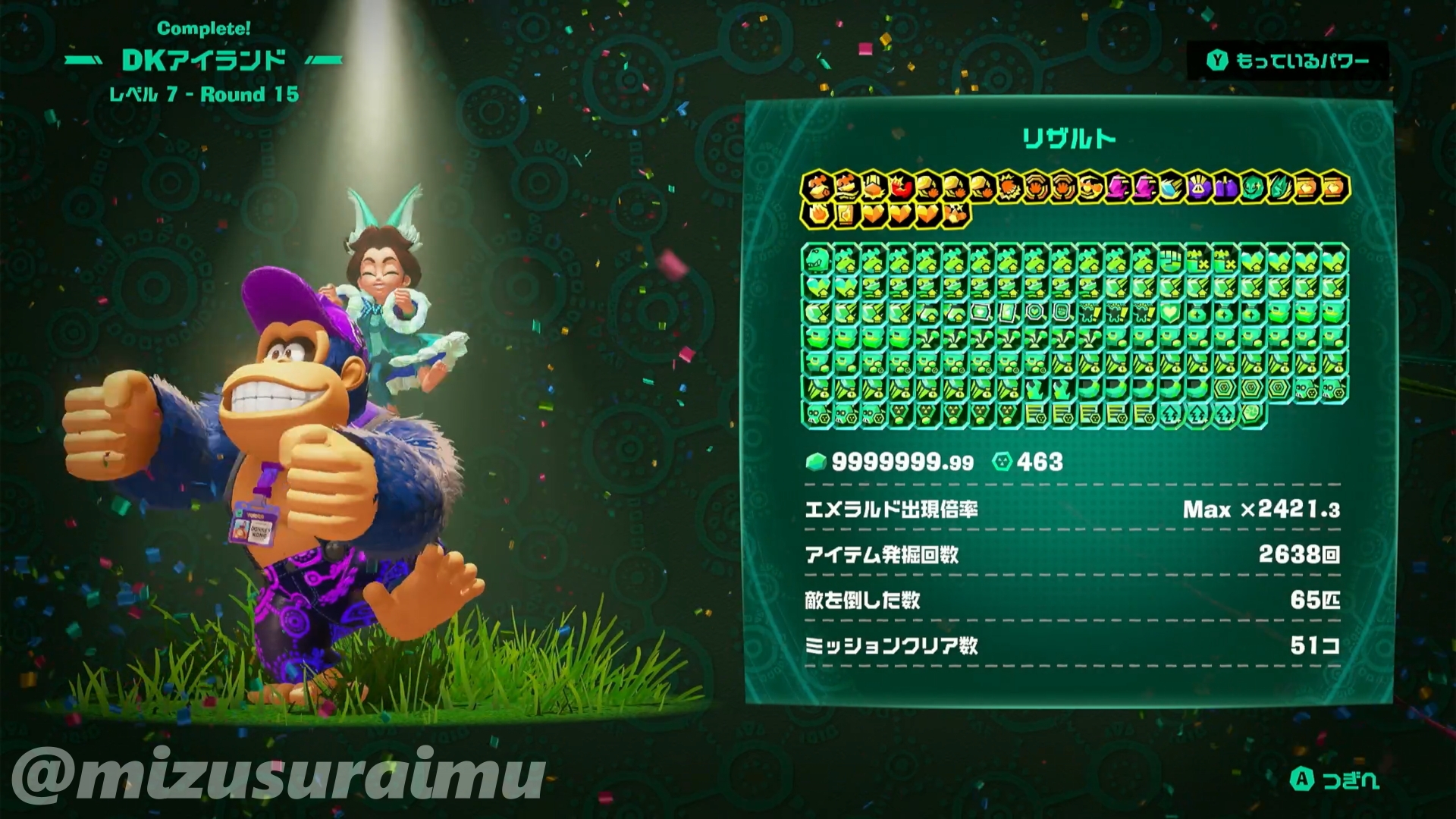 こうしてエメラルド倍率やアイテム出現倍率が貯まった後半には、破片投げで地形を破壊した際にアイテムが出やすい「シュートセンス」の取得と、ロットンクルールフィギュアの組み合わせでDKアイランドを無茶苦茶にしながら、エメラルドをザクザク掘り出す戦法である。