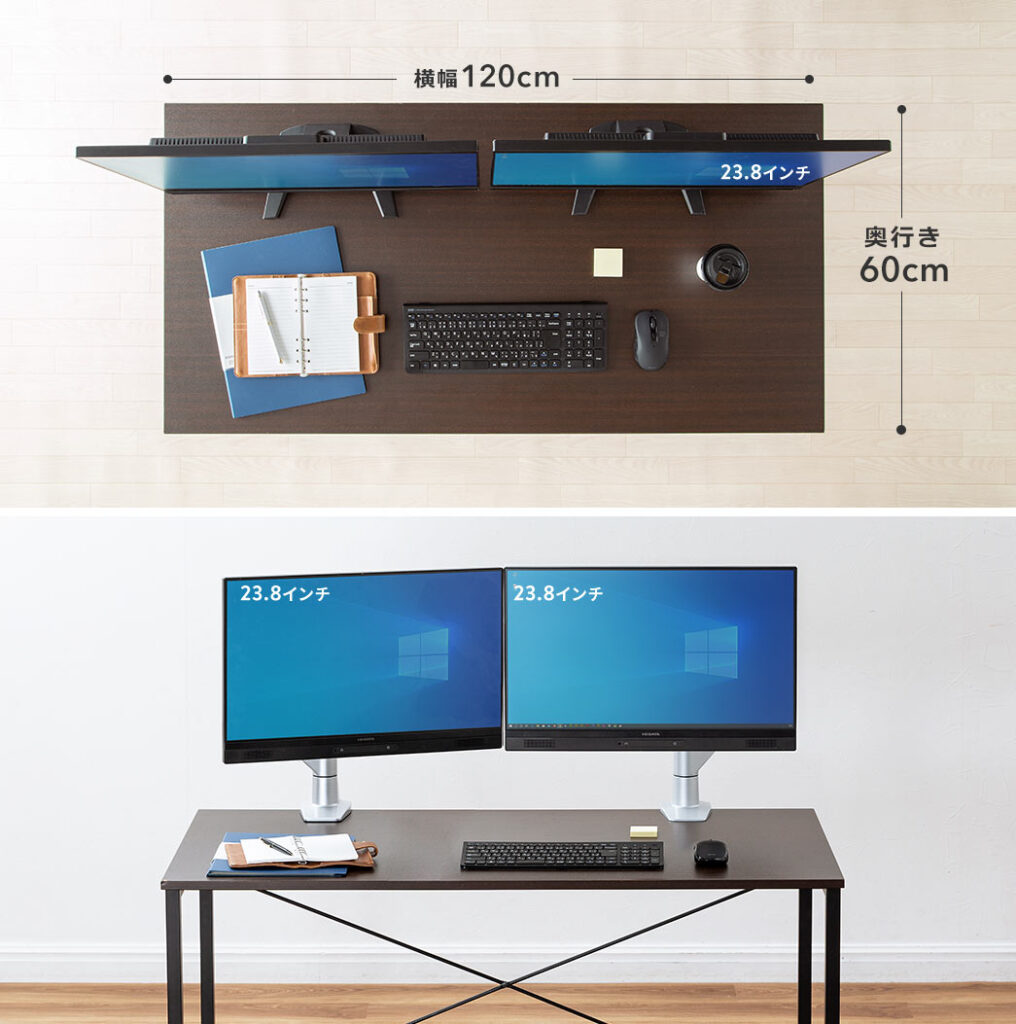 120cmでも24インチモニター二枚を並べられるレベルなので、デュアルディスプレイの参考としては。