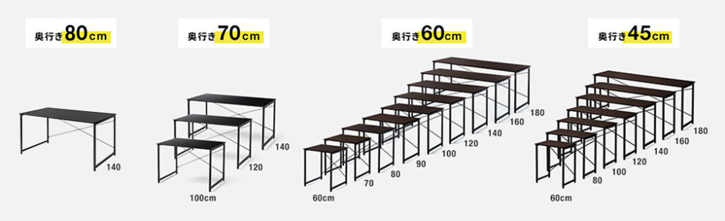 サイズの種類多すぎ。シンプルにおすすめは奥行60cmと横幅120~160cmで