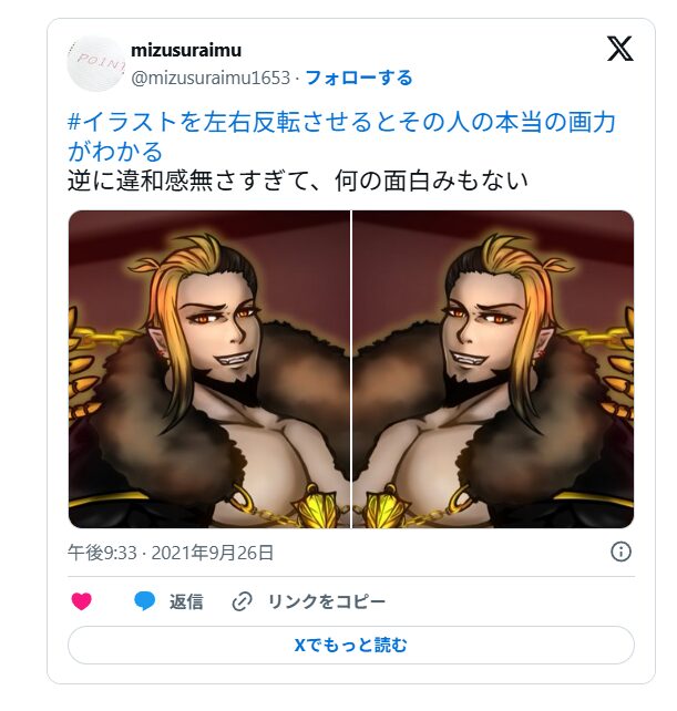 このようにそこそこ上手い絵描きが、左右反転のイラストをTwitterに投稿したところで「いいねが全く付かなかった」事例もある。