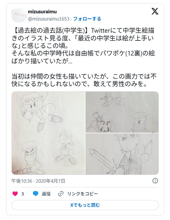 しかしキャラは可愛く、デフォルメで描きやすいことから、中学生の頃はよく描いていた。